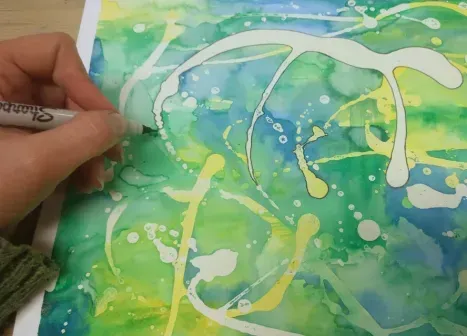 Use your sharpie pen to outline some of the shapes created by the rubber cement resisting the paint. This will simply highlight some of those shapes. You do not need to highlight all of the shapes. Simply pick a few of the most interesting to you! Be creative and have fun! You can also doodle in some of the shape if you wish…you are only limited by your imagination.