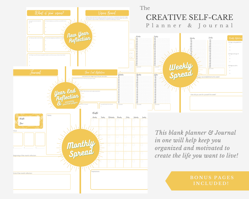 A: Creative self-care is all about you! This planner is designed to tap into your inner creativity and help with self-discovery in your day to day life through daily planning, reflecting, and written/art journal prompts. All prompts are accessible to the creatively curious weather you are an experienced creative or just starting out.