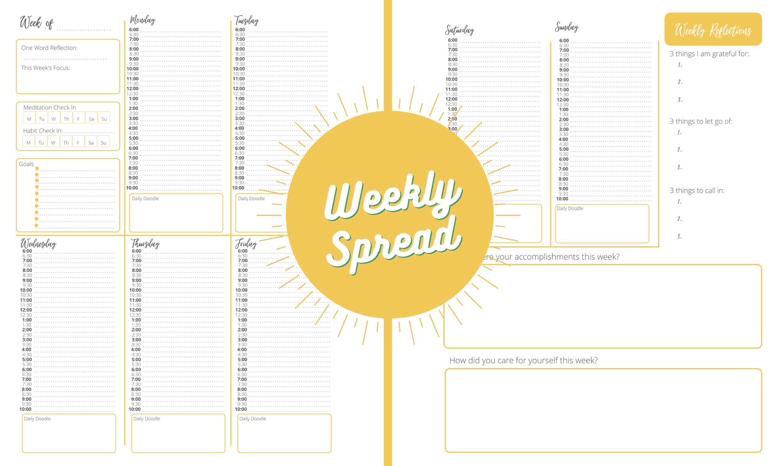 This planner is what I use to keep myself focused and on track! It is not dated so you can start using it at any point throughout the year without “wasting” pages. Space is provided each month/week for both goal setting and short reflections. I know I don’t have time to write a novel each week, but it is helpful to have space to jot down a sentence or two as a small check in! I created this planner out of necessity for myself, but I am excited to share it with you!