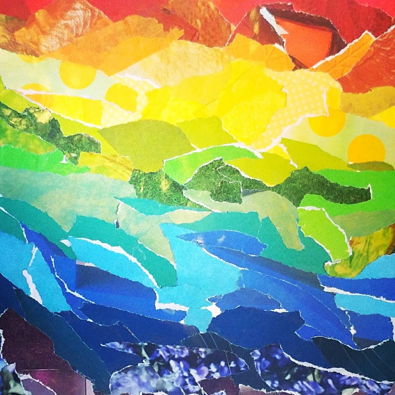 Torn paper collage. Use junk mail or old magazines and simply select colors you like, words that draw your attention, or shapes of interest. Allow yourself to purposefully tear out the color/word/shape. Notice the sound and feel of the tearing paper. Notice how it feels in your body as you tear the paper. Once you have a collection of torn pieces, arrange them on a separate background page. When you have made an arrangement, which feels interesting to you, use a glue stick to glue the pieces to your page.