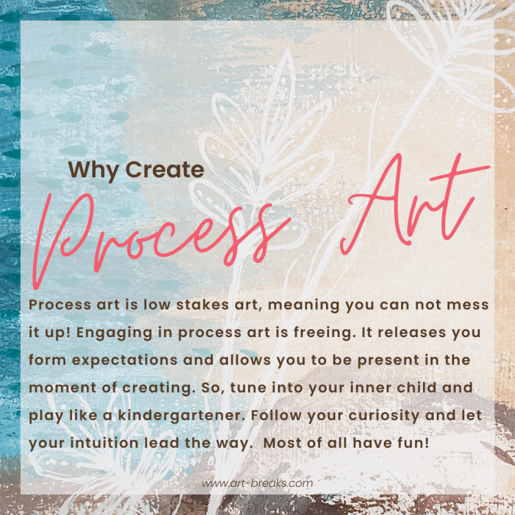 Process art focuses on the “doing” aspect of creating. This type of art is for everyone. You do not need any predetermined skill or ability. All you need is an openness to explore, the ability to play, and a curiosity to guide you. Process art is for everyone. The process of creating is a gift that all humans possess. It is our birthright!